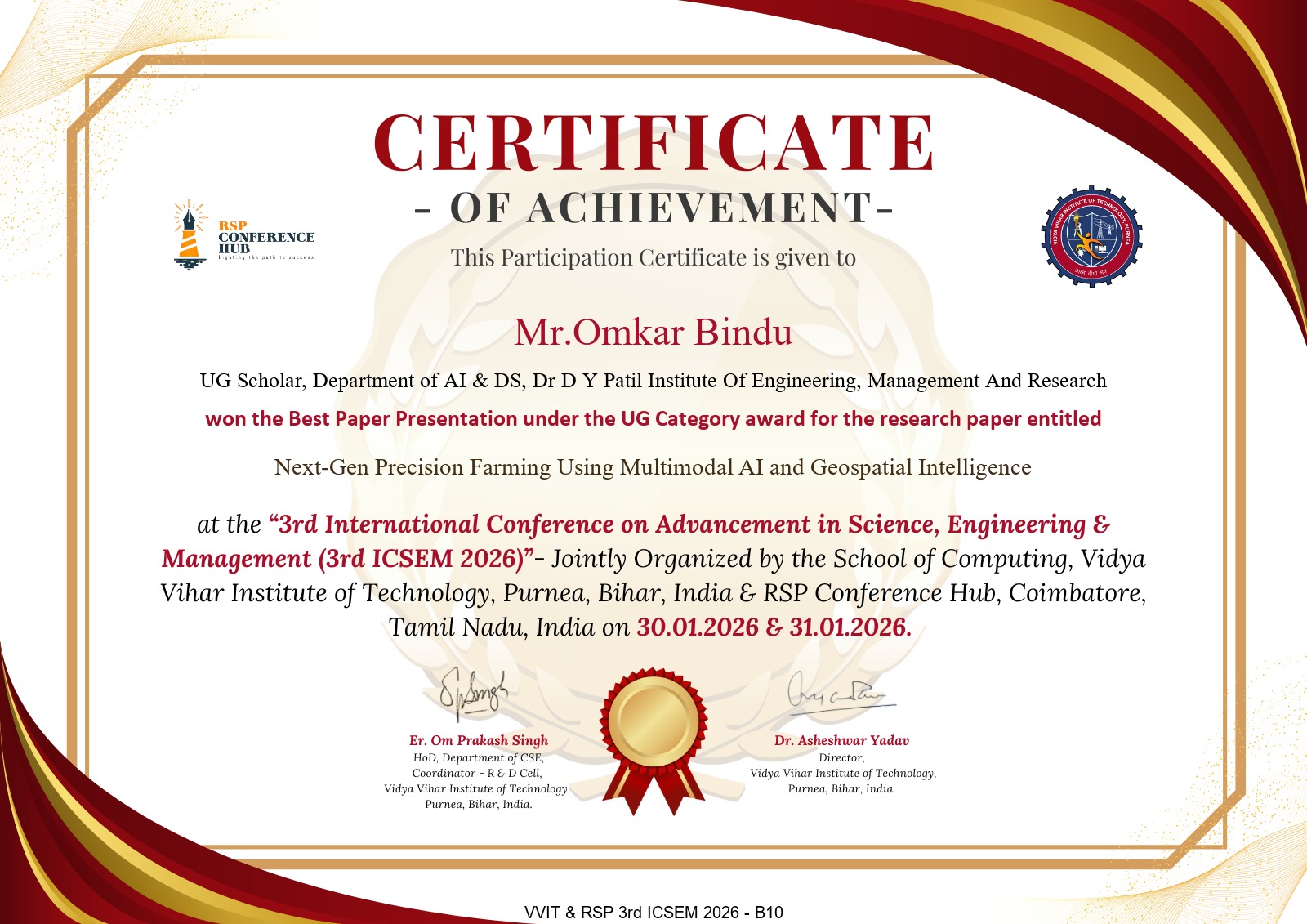 We are happy to share that our students Omkar Bindu & Team won best paper presentation under the UG category award for the research paper "NextGen Precision Farming using multimodal AIand Geospatial Intelligence" at 3rd ICSAM 2026 on 30 January 2026.