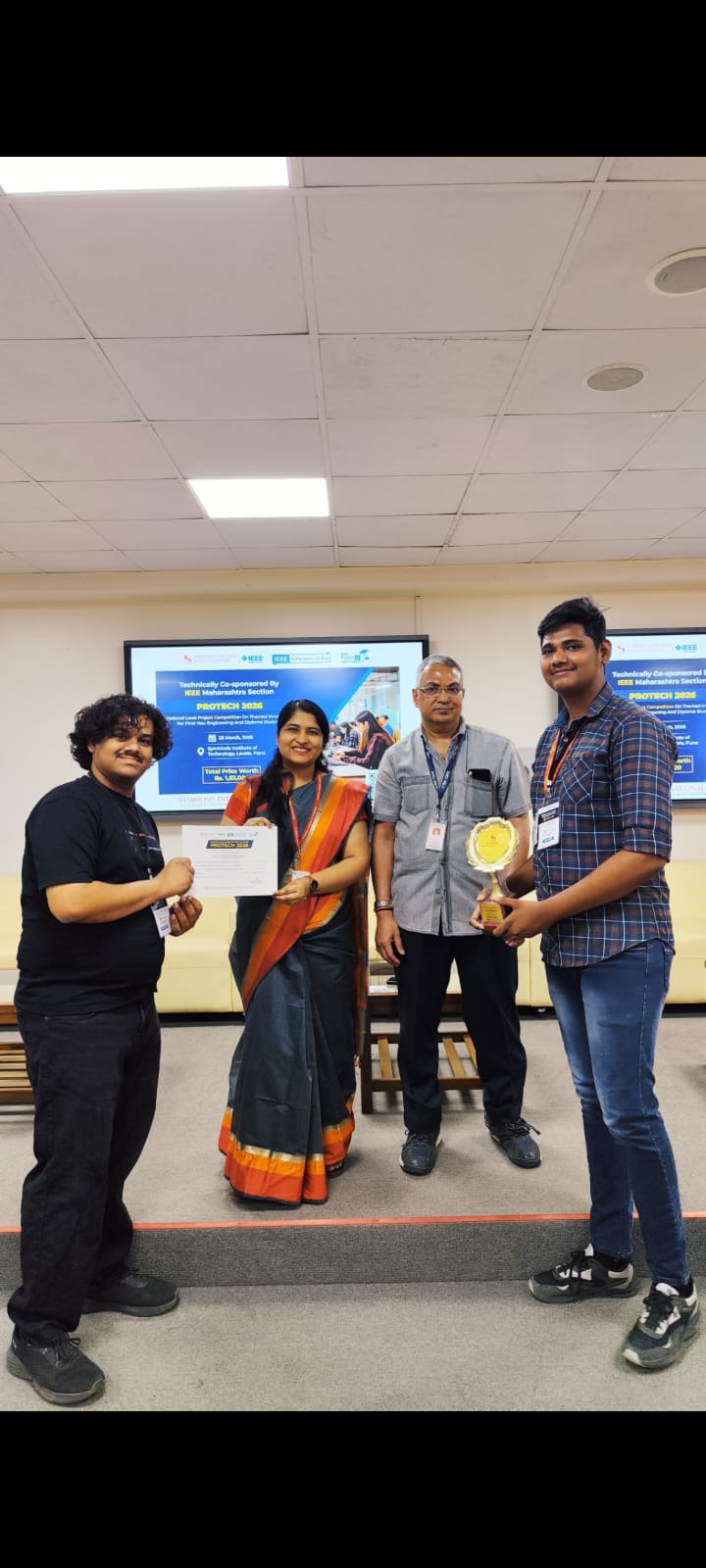 We are happy to share that our students Rohit and Rahul participated in ProTech 2026 Project Competition organised by Symbiosis Institute of Technology and sponsored by IEEE on 28th March 2026 as Team Optopus, and we are proud to announce that the team secured the First Prize in AI and Connected Sensing & Intelligence Domain.
